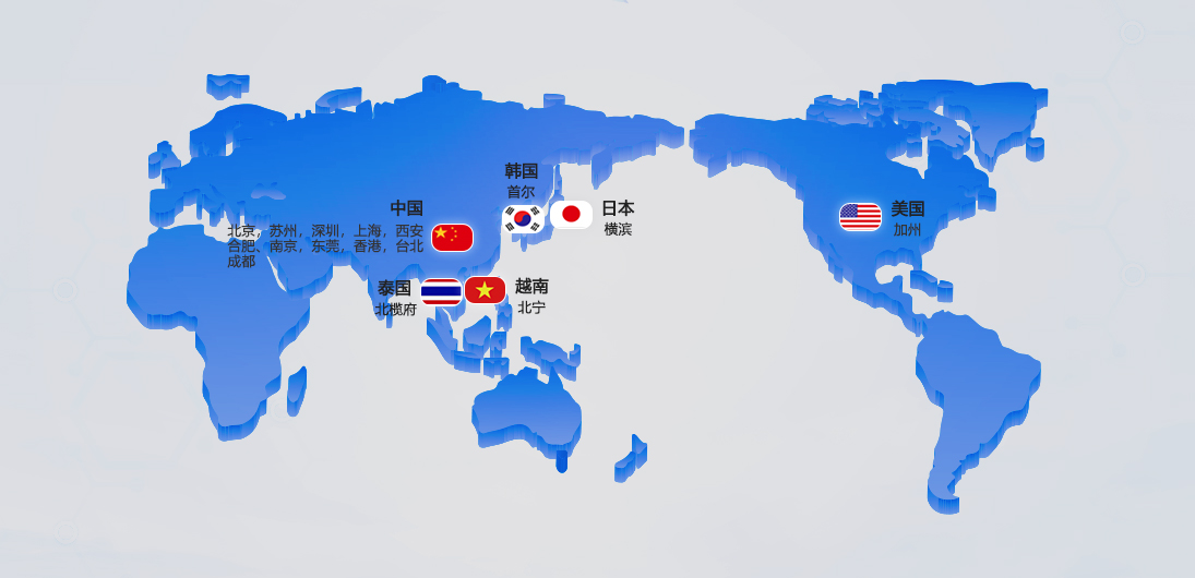 中國(深圳, 上海, 南京), 美國(圣地亞哥,硅谷/圣何塞)